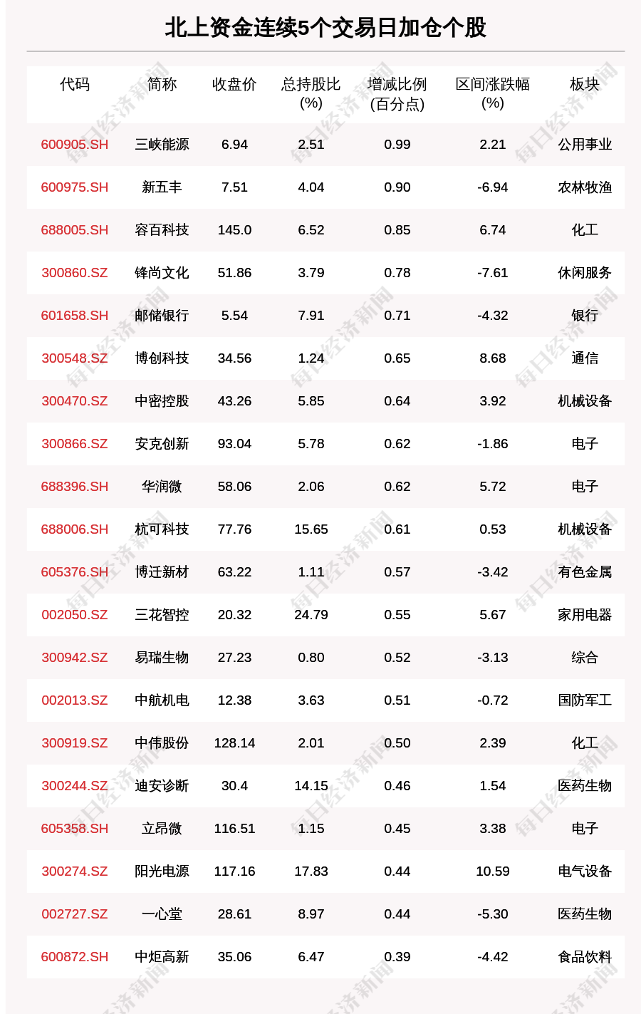 每經(jīng)AI快訊,2月25日,北上資金連續(xù)5個交易日買入62個股。北上資金連續(xù)5個交易日加倉個股中,三峽能源(600905.SH,收盤價:6.94元)增持比例增幅最大,5個交易日增持0.99個百分點(diǎn),其他增持比例較大的個股包括新五豐(600975.SH,收盤價:7.51元)、容百科技(688005.SH,收盤價:145.0元)、鋒尚文化(300860.SZ,收盤價:51.86元),分別增持0.90個百分點(diǎn)、0.85個百分點(diǎn)、0.78個百分點(diǎn)。