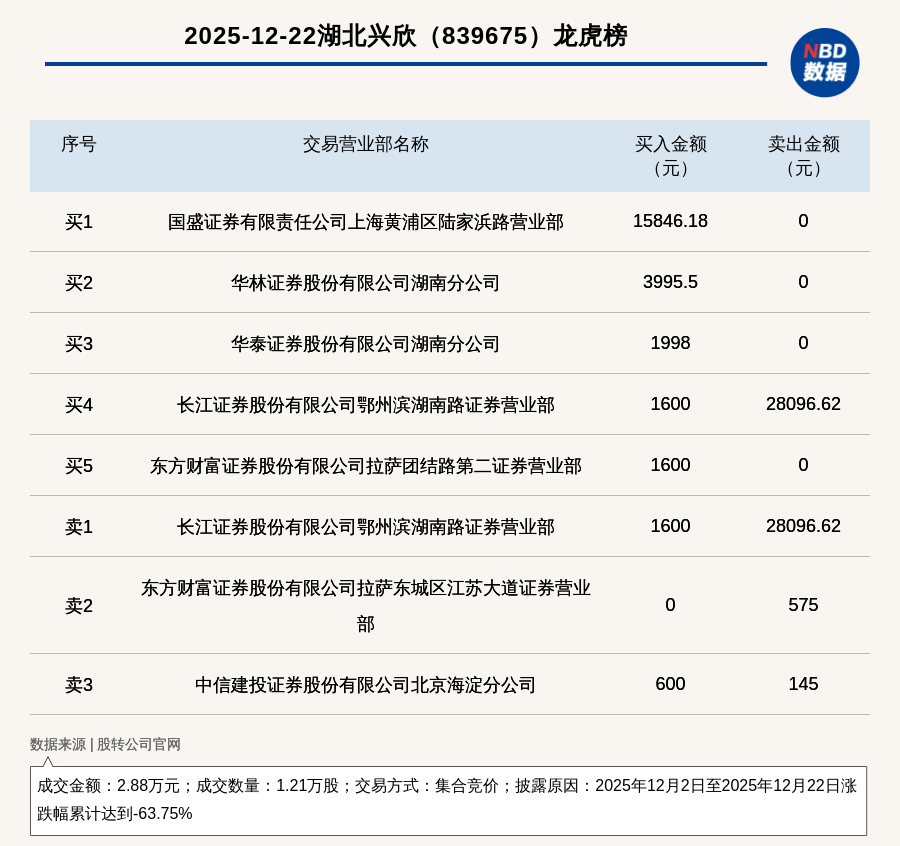 每經(jīng)訊,2025年12月22日,新三板創(chuàng)新層公司湖北興欣(839675,收盤價(jià):1.45元)登上龍虎榜,交易方式是集合競(jìng)價(jià),披露原因是2025年12月2日至2025年12月22日漲跌幅累計(jì)達(dá)到-63.75%,成交數(shù)量1.21萬(wàn)股,成交金額2.88萬(wàn)元。買一席位為國(guó)盛證券有限責(zé)任公司上海黃浦區(qū)陸家浜路營(yíng)業(yè)部,買入1.58萬(wàn)元;賣一席位為長(zhǎng)江證券股份有限公司鄂州濱湖南路證券營(yíng)業(yè)部,賣出2.81萬(wàn)元。