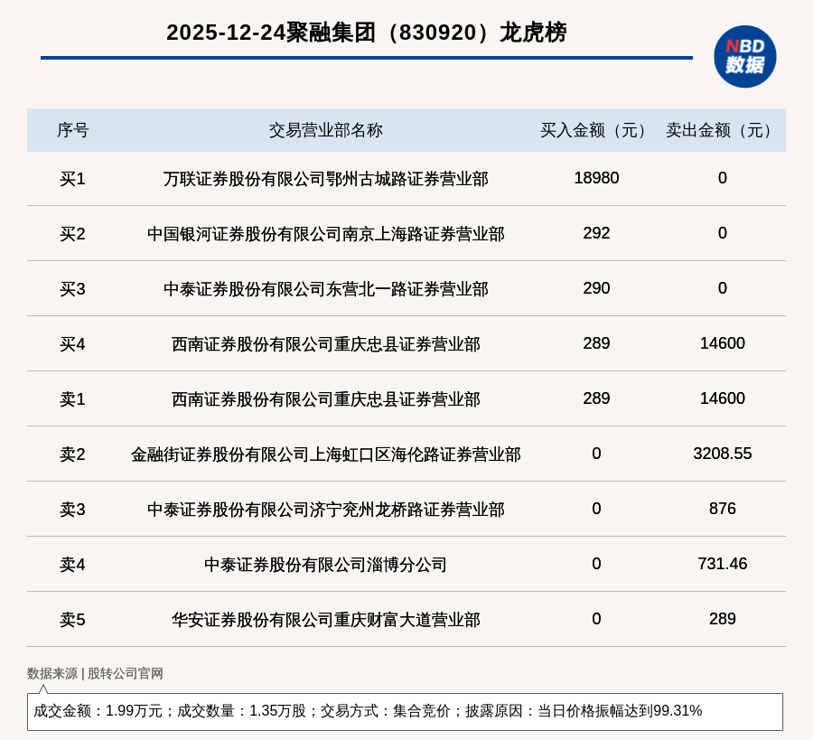 每經(jīng)訊,2025年12月24日,新三板創(chuàng)新層公司聚融集團(tuán)(830920,收盤價(jià):1.46元)登上龍虎榜,交易方式是集合競價(jià),披露原因是當(dāng)日價(jià)格振幅達(dá)到99.31%,成交數(shù)量1.35萬股,成交金額1.99萬元。買一席位為萬聯(lián)證券股份有限公司鄂州古城路證券營業(yè)部,買入1.9萬元;賣一席位為西南證券股份有限公司重慶忠縣證券營業(yè)部,賣出1.46萬元。