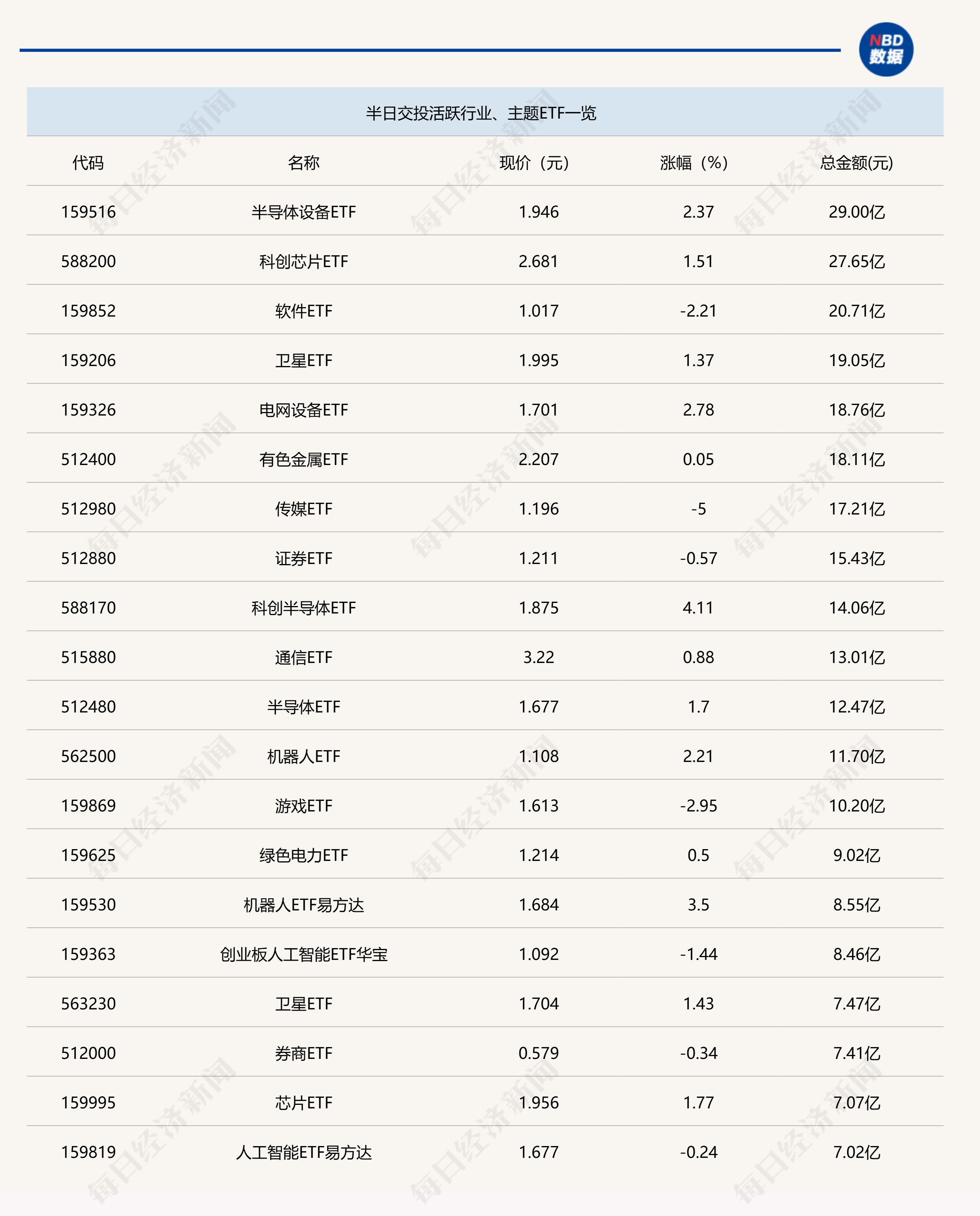 今日上午,半導(dǎo)體設(shè)備相關(guān)ETF交投活躍,其中,半導(dǎo)體設(shè)備ETF(159516)半日成交金額達(dá)到29億元,放量明顯;另外,科創(chuàng)半導(dǎo)體(588170)半日成交金額也接近15億元??缇矱TF方面,香港證券ETF易方達(dá)(513090)半日成交金額為43.13億元,量能呈現(xiàn)縮減態(tài)勢(shì)。
