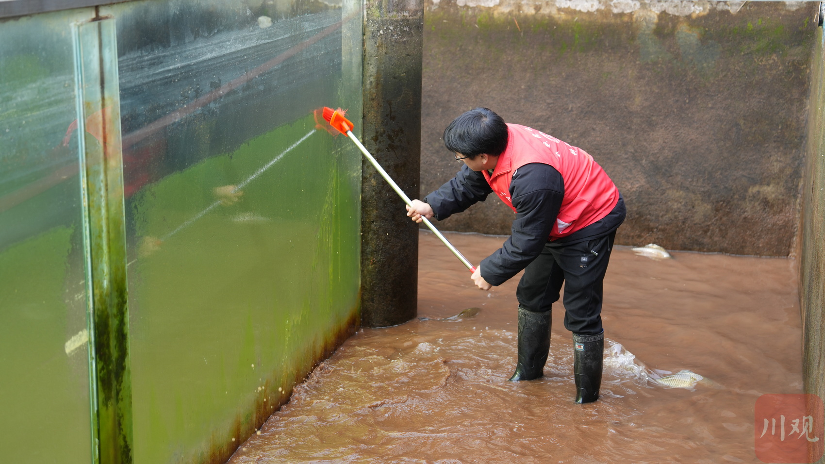 孔秋宏正在清理魚池。