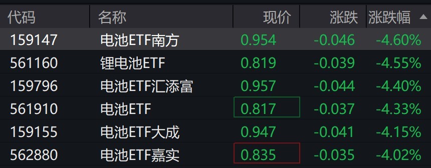 受盤面影響,電池相關(guān)ETF跌超4%。