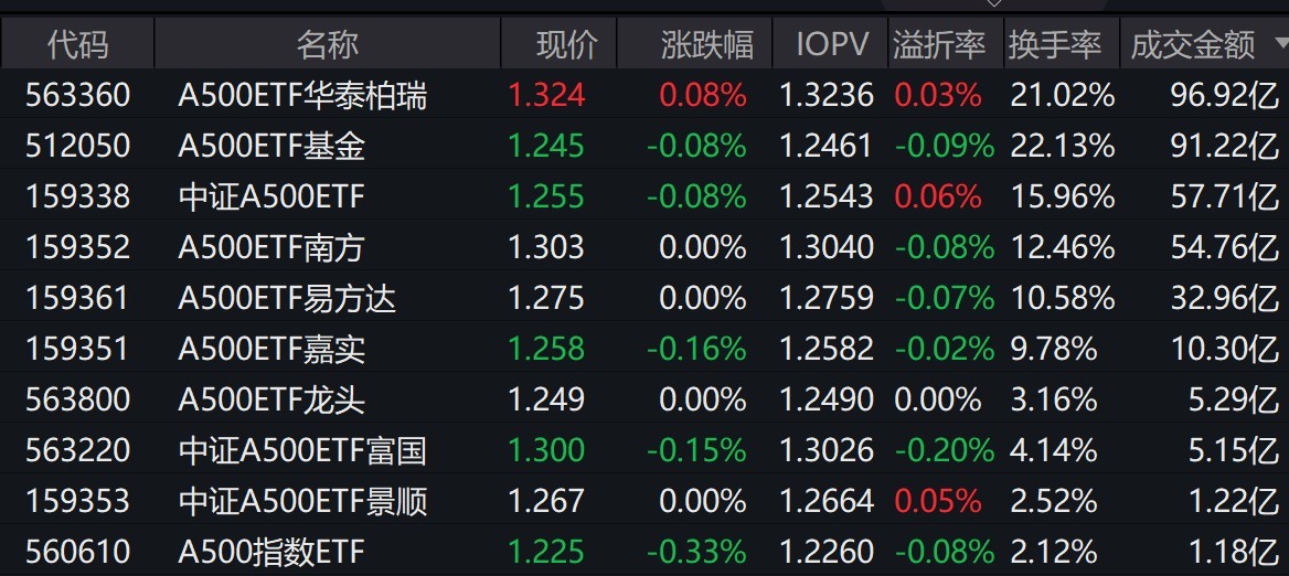 截至上午收盤(pán),場(chǎng)內(nèi)跟蹤中證A500指數(shù)的ETF漲跌互現(xiàn)。其中,有10只中證A500相關(guān)ETF成交額超1億元,2只超91億元。A500ETF華泰柏瑞、A500ETF基金早盤(pán)成交額分別為96.92億元、91.22億元。