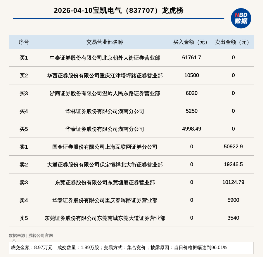 每經(jīng)訊,2026年4月10日,新三板創(chuàng)新層公司寶凱電氣(837707,收盤價(jià):3.01元)登上龍虎榜,交易方式是集合競(jìng)價(jià),披露原因是當(dāng)日價(jià)格振幅達(dá)到96.01%,成交數(shù)量1.89萬(wàn)股,成交金額8.97萬(wàn)元。買一席位為中泰證券股份有限公司北京朝外大街證券營(yíng)業(yè)部,買入6.18萬(wàn)元;賣一席位為國(guó)金證券股份有限公司上?;ヂ?lián)網(wǎng)證券分公司,賣出5.09萬(wàn)元。