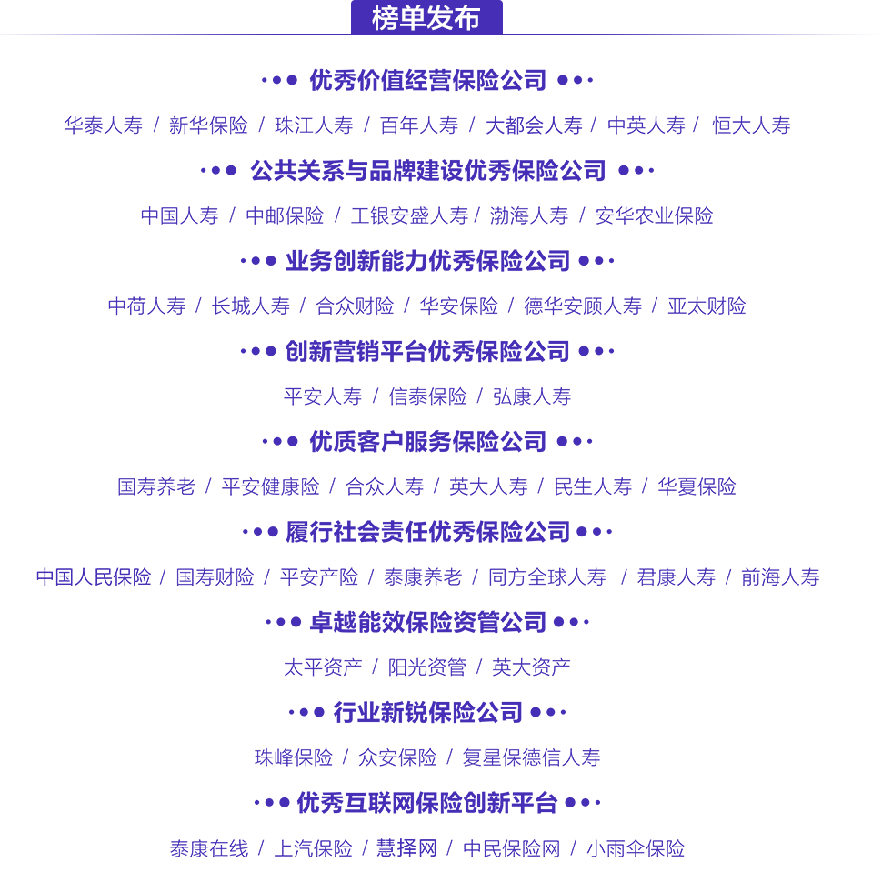 本次評選將秉持客觀真實、公正透明、范圍廣泛的原則,以“第5個保險公眾宣傳日”活動為契機,再次將視角聚焦于新生態(tài)環(huán)境下中國保險業(yè)最具經(jīng)營智慧的風云企業(yè),力求準確把握保險風云脈絡。榜單以壽險、產(chǎn)險、資管為經(jīng)度,以經(jīng)營理念、品牌建設、業(yè)務創(chuàng)新、客戶服務、償付能力、社會責任、資管能效為緯度來設置獎項。