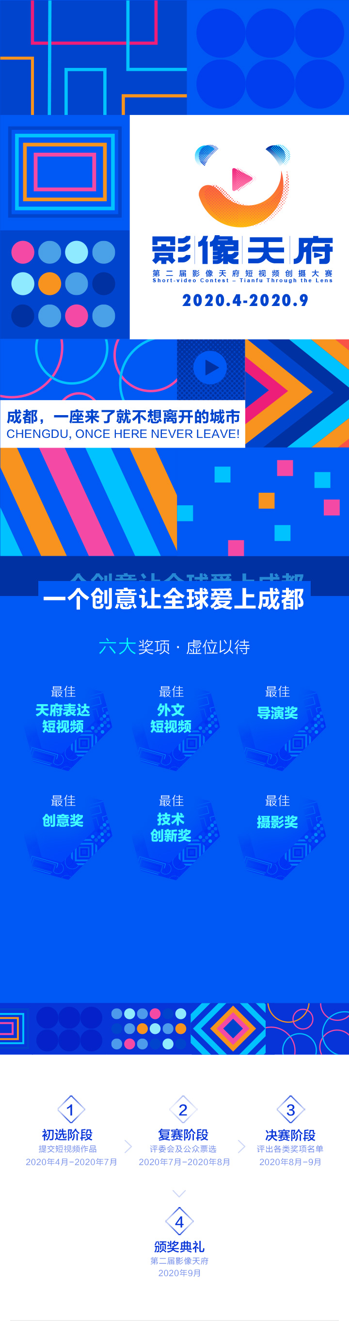 “第二屆影像天府·短視頻創(chuàng)攝大賽”于2020年4月正式啟動(dòng),邀約全球創(chuàng)攝愛好者續(xù)寫“成都,一座來了就不想離開的城市”篇章,征集優(yōu)質(zhì)影像作品。本次大賽設(shè)置最佳天府表達(dá)短視頻、最佳外文短視頻、最佳導(dǎo)演獎(jiǎng)、最佳創(chuàng)意獎(jiǎng)、最佳技術(shù)創(chuàng)新獎(jiǎng)、最佳攝影獎(jiǎng)六大專業(yè)。評委包括中國電影家協(xié)會副主席,上海電影家協(xié)會主席任仲倫;艾美獎(jiǎng)得主,美國著名影視導(dǎo)演、制片人Mark